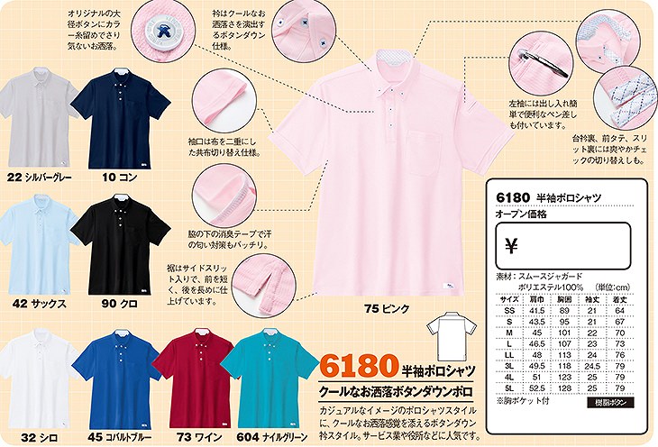 ジーベック クールビズ 半袖ポロシャツ 作業着 通年 メンズ レディース ストレッチ 吸汗 速乾 消臭 軽量 通気性 蒸れない カタログ掲載 ボタンダウンシャツ 半袖シャツ 作業服 作業シャツ ワーク マン おしゃれ 大きいサイズ XEBEC 6180
