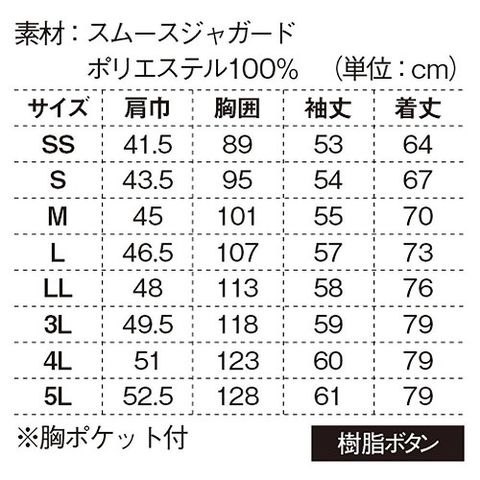 | ※生地素材、ボタン類、製品サイズ等、予告無く仕様変更となる場合がございます。確認が必要な際にはお問合せください。 ※男女兼用サイズにつき、女性用としてご購入の際はサイズ表を充分ご確認ください。 |