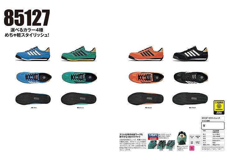 JSAA型式認定シューズ。スタイリッシュな先細デザインと鮮やかなカラーでラインナップ。スチール先芯仕様でも680g(両足)のめちゃ軽スタイリッシュなシューズです。