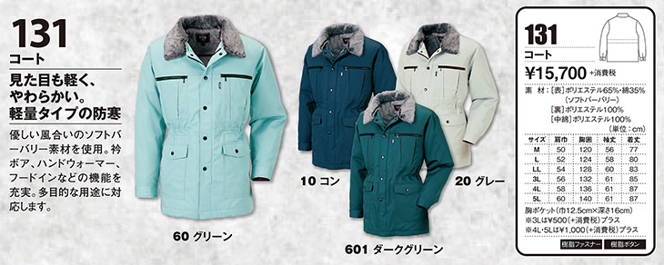 | 軽い着心地、丈夫、保温性、温かい、撥水加工 |