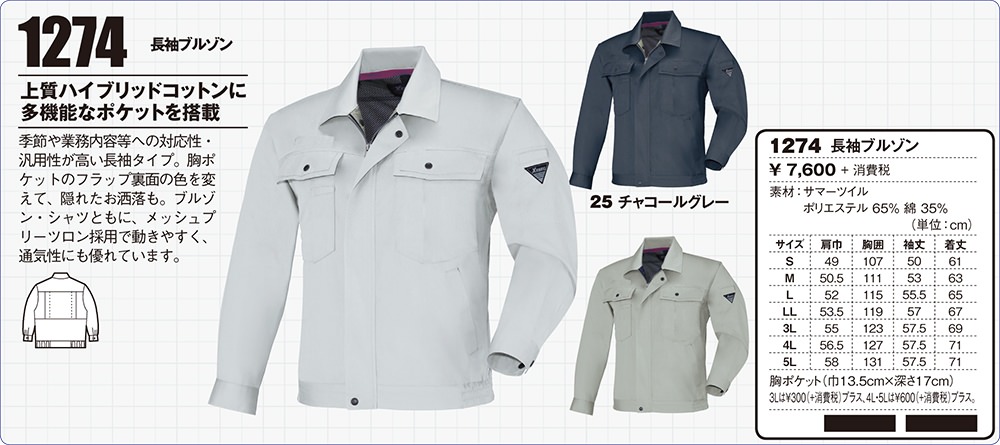 | 【変更開始年月:2021年4月】 こちらの品番の商品サイズに関しまして、メーカーの在庫がなくなり次第順次記載しておりますサイズから「肩幅-2cm・袖丈+1cm」へ切り替えとなります。合わせて「胸ポケット内部の小ポケット無し」へと切り替えとなります。ご注文の前にお問い合わせいただきましたらメーカーの切り替え状況をお調べできますので、ご不安の方は事前にお問い合わせくださいませ。 |