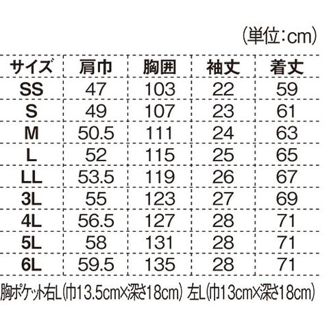 | 【変更開始年月:2021年4月】 こちらの品番の商品サイズに関しまして、メーカーの在庫がなくなり次第順次記載しておりますサイズから「肩幅-2cm・袖丈+1cm」へ切り替えとなります。合わせて「胸ポケット内部の小ポケット無し」へと切り替えとなります。ご注文の前にお問い合わせいただきましたらメーカーの切り替え状況をお調べできますので、ご不安の方は事前にお問い合わせくださいませ。 |