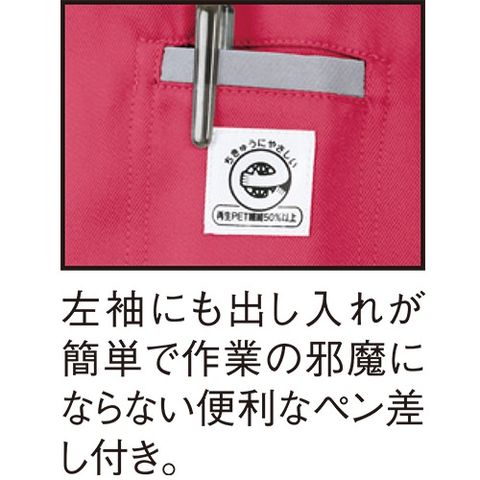 | 帯電防止素材:人体に帯電した静電気による生産障害や事故を防ぐ帯電防止素材。 速乾性抜群:吸収した汗を素早く乾かす素材を使用して、爽やかさをキープ。 リサイクル素材:PETボトルから再生した地球環境に優しいエコロジー素材です。 吸汗性抜群:ムレやベトツキの原因となる汗を素早く吸収する素材を使用。 |