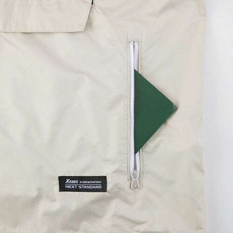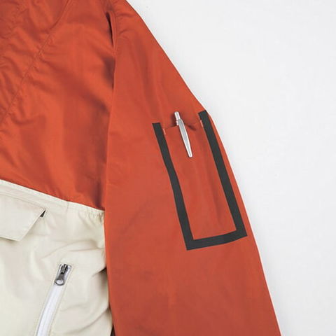 | フロント:大口ファスナーポケット。 フード:一体型フード(スピンドル調整付き)。 両脇:着脱しやすいファスナー仕様。 裾(内側):裾調節しやすいスピンドル仕様。 左袖:ペン差し。 袖口:マジックテープ。 首元:調整ヒモで空気の抜けを調節。 |
