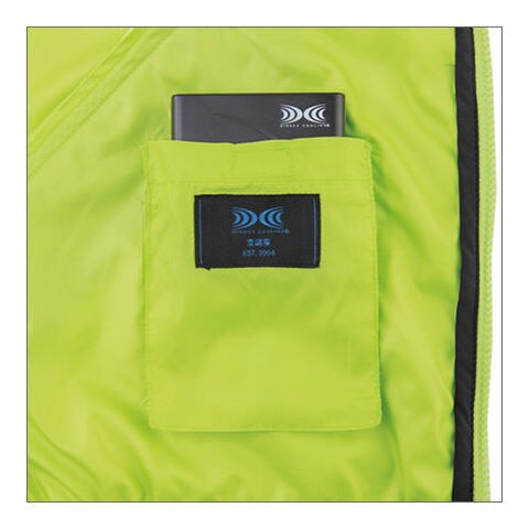 | 袖口はニットバインダー仕様で空気が逃げにくい、首元の調整ヒモで空気の抜けを調節、両脇はモノが落ちにくいファスナー付きポケット、左内側バッテリーポケット |