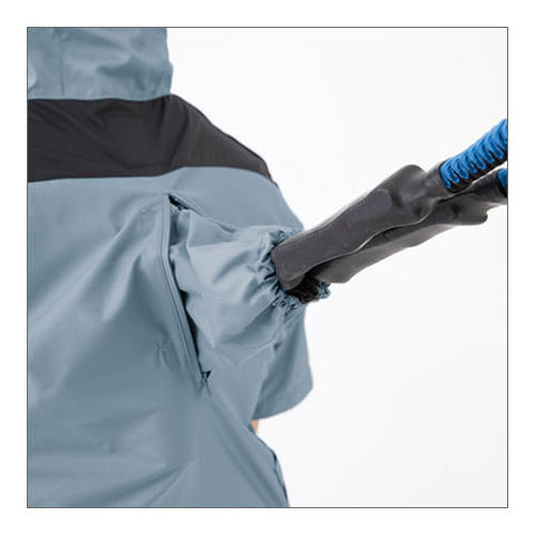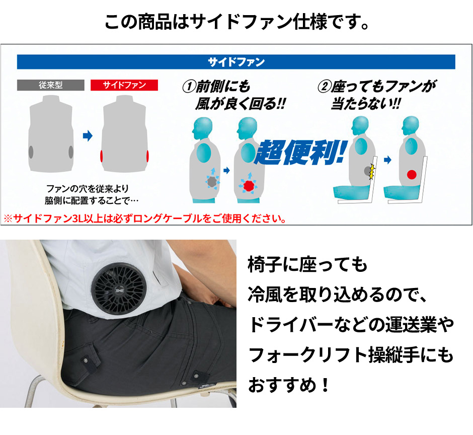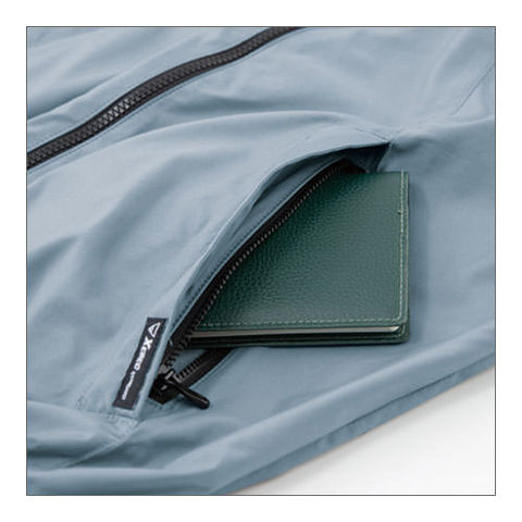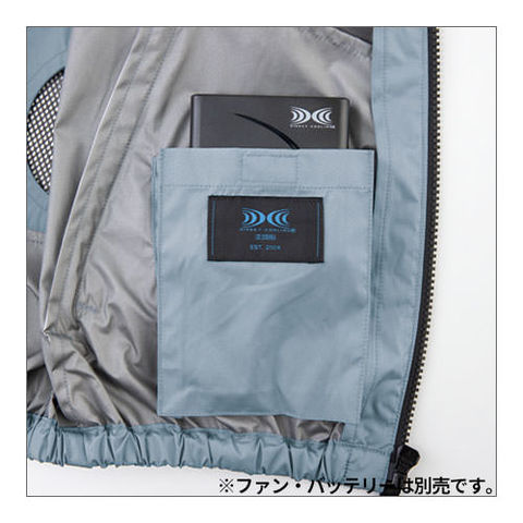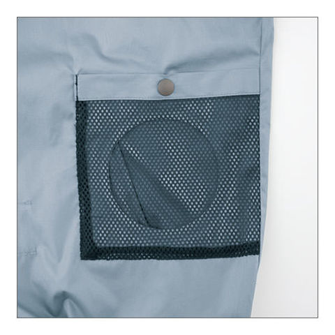 | 背中からランヤードを出し取り出し口を絞りランヤードを使用しない時はファスナー式で簡単に収納できます、左右に引っ張ると瞬時に外せるクイックファスナー、ファン落下防止メッシュ、両脇フックかけDカン付き、袖口ドットボタンで空気の抜けを調整、左袖ペン差し、ヘルメット対応の大型フード、両脇ファスナーポケット、襟調整ヒモで空気の抜けを調整、左内側バッテリーポケット |