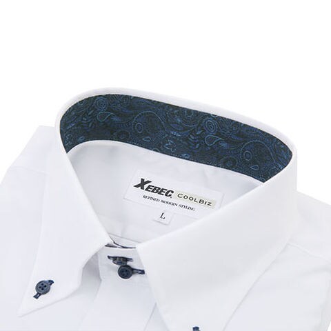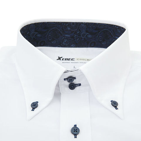 | 2つボタンで襟高なデュエボットーニ襟の裏にペイズリー柄を配した、オシャレ度の高いクールビズシャツ。長袖はカフス裏からもペイズリー柄がのぞきます。ボタン&ボタンホールのコントラストもアクセント。 |