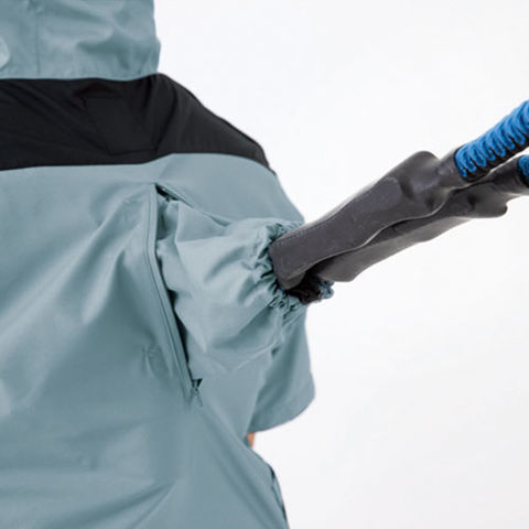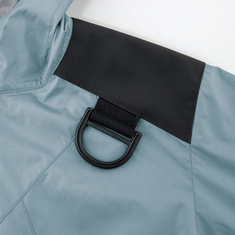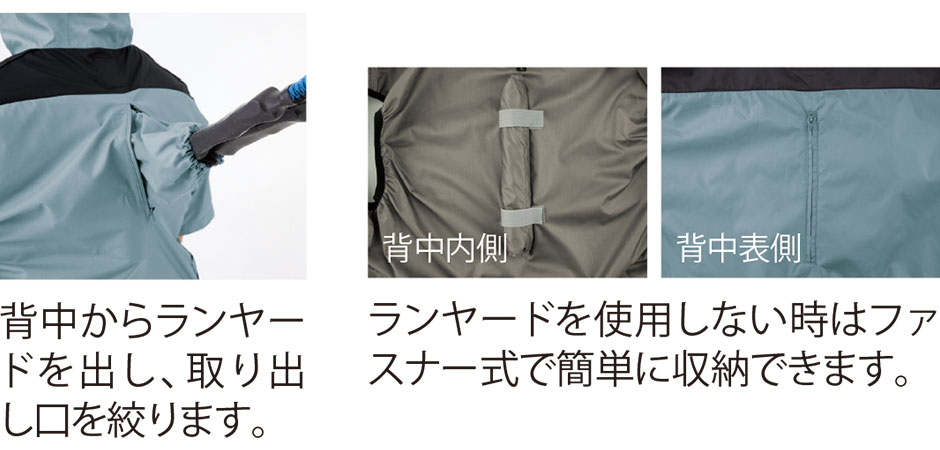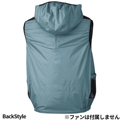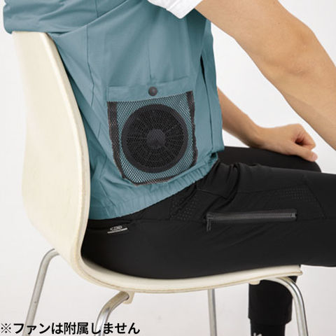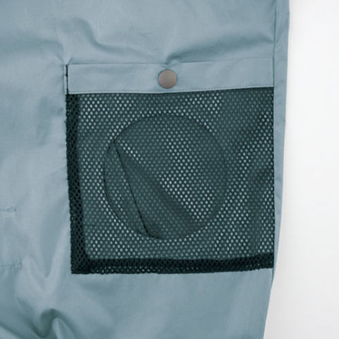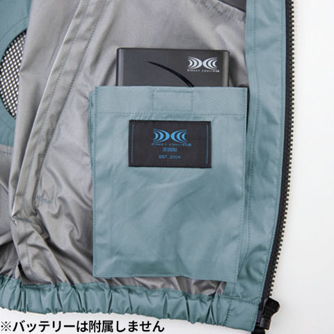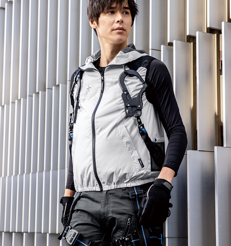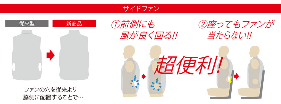 サイドファン仕様、両脇ファスナーポケット、首元の調整ヒモで空気の抜けを調節、袖口はニットバインダー仕様で空気が逃げにくい、左内側バッテリーポケット、背中ランヤード取出し口、左右に引っ張ると瞬時に外せるクイックファスナー、ファン落下防止メッシュ、両胸フックかけDカン付