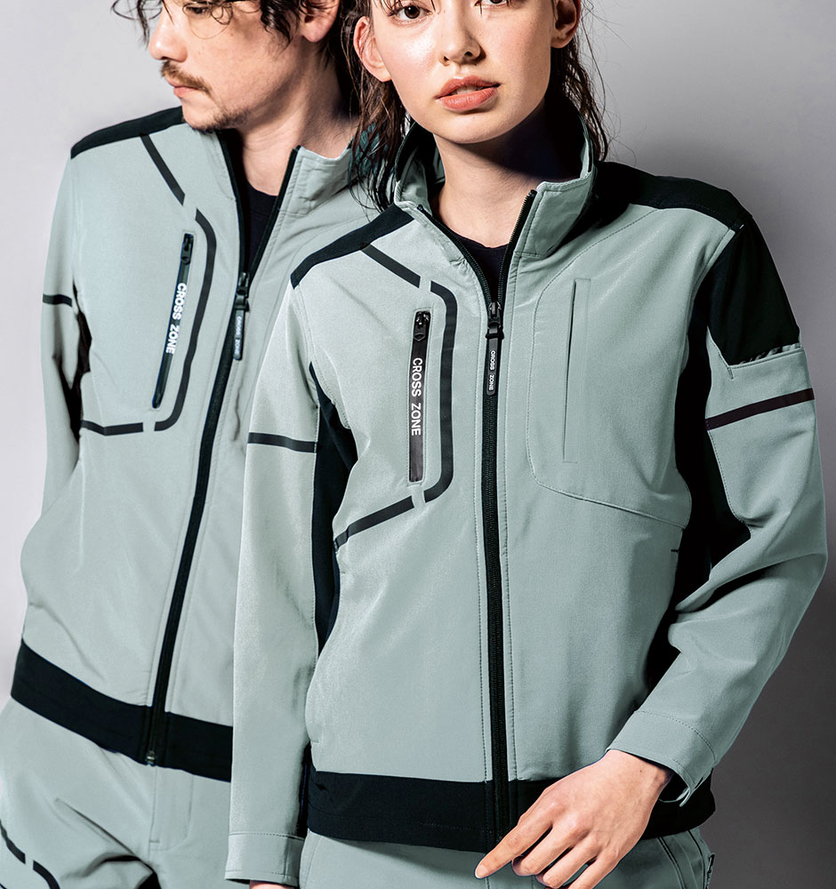 再生ポリエステル素材のSDGsに貢献する2WAYストレッチを使用。配色の効いたスタイリッシュなデザインでありながら、胸ポケット、袖、後裾に反射テープを使用し、安全性にも優れたワークウェアです。