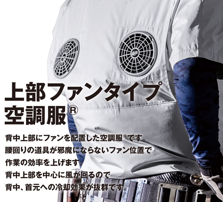 | 背中上部にファンを配置した空調服 腰回りの道具が邪魔にならないファン位置で作業の効率を上げます。背中上部を中心に風が回るので背中、首元への冷却効果が抜群です。 ●腰回りの干渉を軽減した上部ファン仕様 ●遮熱コーティング ●紫外線カット ●物の落ちにくい両脇ファスナーポケット |
