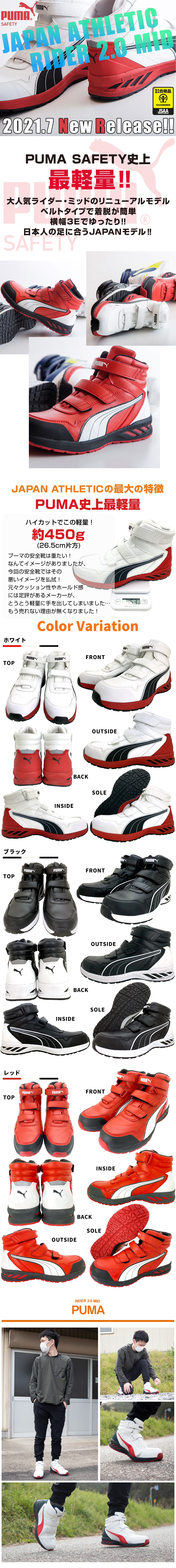 安全靴 ハイカット プーマ RIDER 2.0 MID PUMA ライダー 2.0 ミッド 新商品 新作 ミッドカット マジックテープ 軽量 人工皮革 JSAA規格 スニーカー 作業靴 メンズ レディース ストリート カジュアル かっこいい おしゃれ 建築 建設 運送 工場 25.0~28.0cm