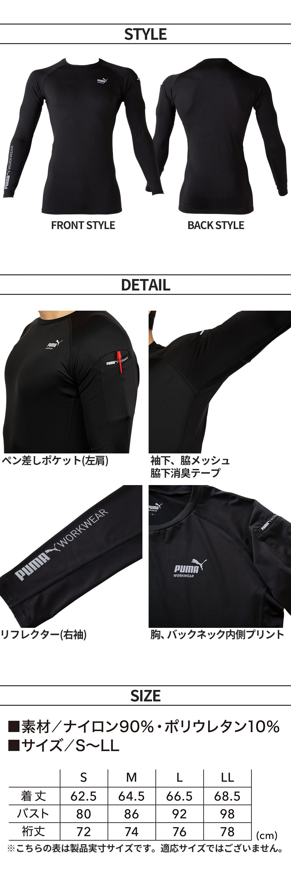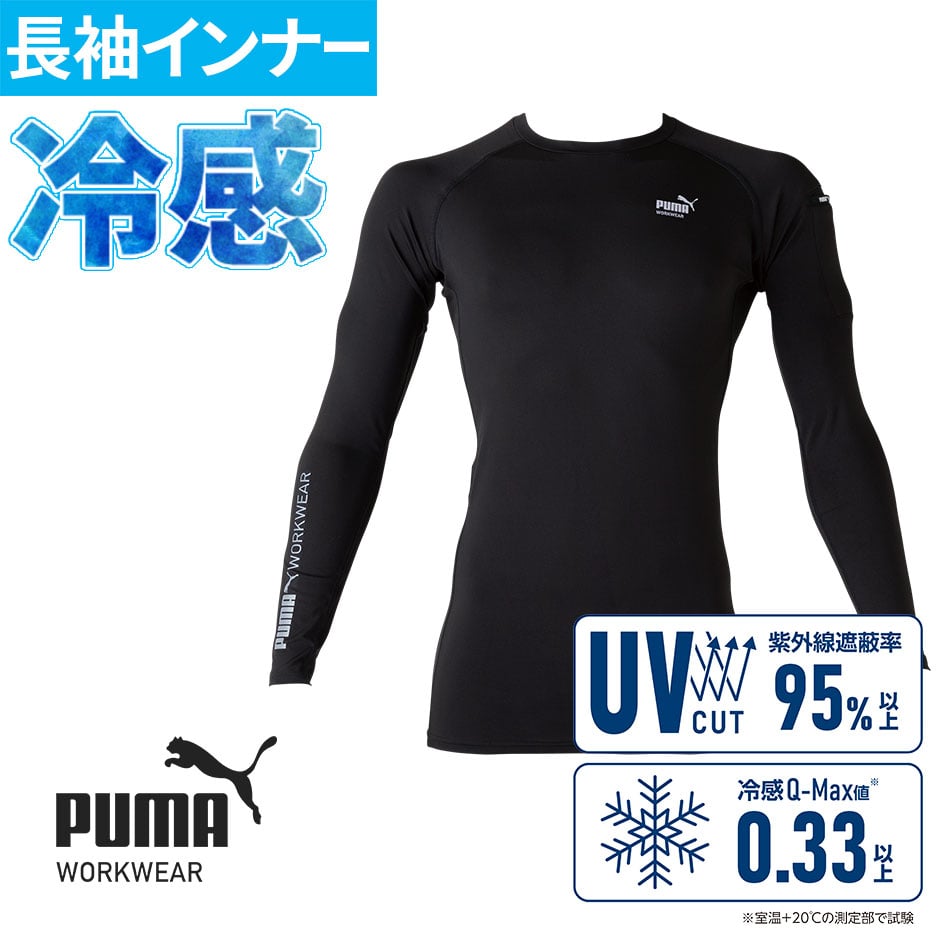 作業ウェア PUMA プーマ 長袖パフォーマンスウェア インナー メンズ 冷感 スポーツ 冷感インナー メンズインナー 夏 涼しい アンダーシャツ 黒 ストレッチ 長袖 消臭テープ 夏用 熱中症対策 UVカット 自転車 作業着 作業服 PW-2010N 筋トレ ランニング 下着 ブラック