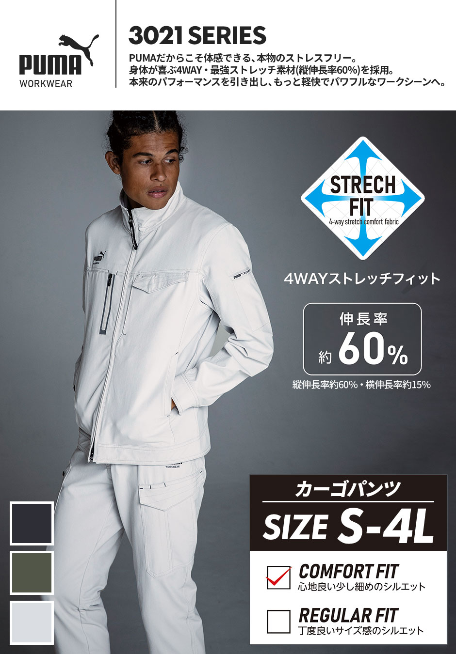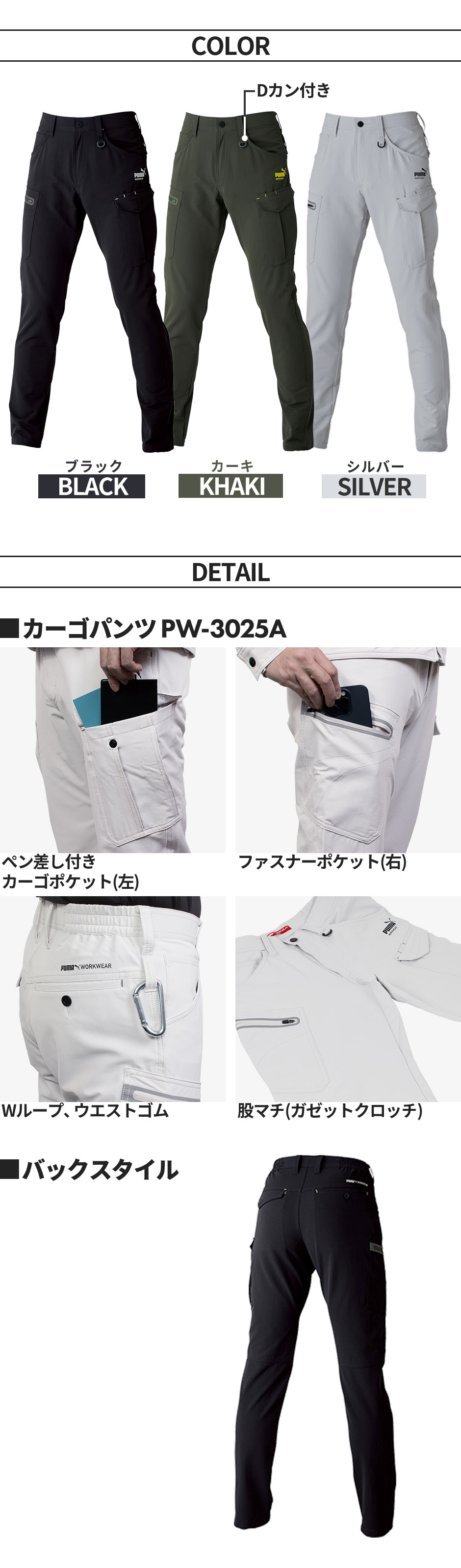 作業ウェア PUMA プーマ カーゴパンツ 作業着 ストレッチ ズボン 作業服 通年 メンズ パンツ 大きいサイズ 4L 作業着 かっこいい おしゃれ 人気 ユニフォーム 黒 シルバー ワークウェア 作業 PW-3025A