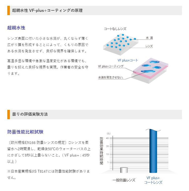 VF plus+コートレンズは、レンズの曇りを発生させやすい過酷な環境でも、曇りの原因となる水滴の発生を抑え、良好な視界を保ちます。