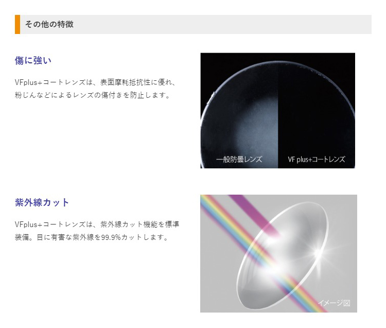 またVFplus+コーティング膜は、レンズ基材のポリカーボネートとの密着性に優れ、ふき取りを繰り返しても剥がれにくく、防曇効果の持続性に貢献しています。