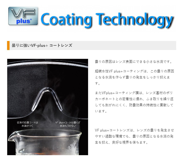 | 曇りの原因はレンズ表面にできる小さな水滴です。 超親水性VF plus+コーティングは、この曇りの原因となる水滴を作らず曇りの発生をしっかり抑えます。 またVFplus+コーティング膜は、レンズ基材のポリカーボネートとの密着性に優れ、ふき取りを繰り返しても剥がれにくく、防曇効果の持続性に貢献しています。 VF plus+コートレンズは、レンズの曇りを発生させやすい過酷な環境でも、曇りの原因となる水滴の発生を抑え、良好な視界を保ちます。 |
