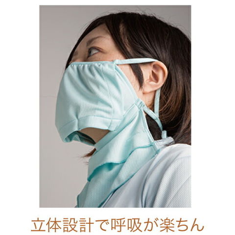 | 長時間作業用のUV加工マスク。首もとまでカバーし、耳裏に負担がかからないように工夫。吸汗速乾素材でムレが気になりません。 ・耳に優しい「布ひも」と2ヵ所掛け。 耳が痛くなりにくい「布ひも」を採用。長い紐は首の後ろで結んで耳裏の負荷を軽減します。マスクを使わないときは耳ひもだけ外すと、落とすことがありません。 ・立体設計と通気スリットで呼吸がスムーズ。 鼻・口周辺にマスクがまとわりつかない立体設計のほか、首をカバーするフリルにもスリットが入っているので自然な呼吸でいられます。 |