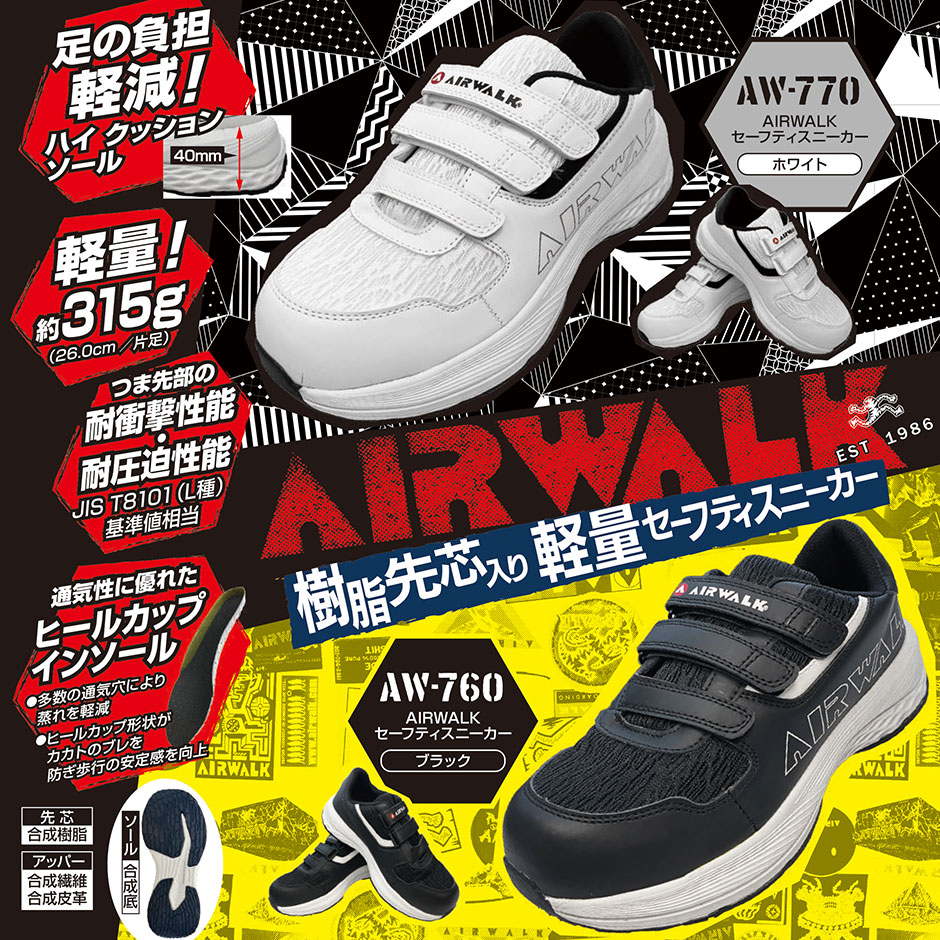 安全靴 ユニワールド AIR WALK エアウォーク セーフティスニーカー AW-760、AW-770 マジックテープ スニーカータイプ 軽量 耐衝撃 耐圧迫 通気 スポーティ