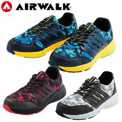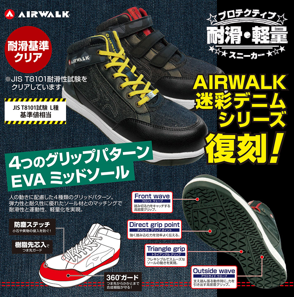 安全靴 ハイカット ユニワールド AIR WALK エアウォーク 迷彩デニム 面ファスナー AW-681 マジックテープ スニーカータイプ 軽量 耐滑 ミッドカット スポーティ