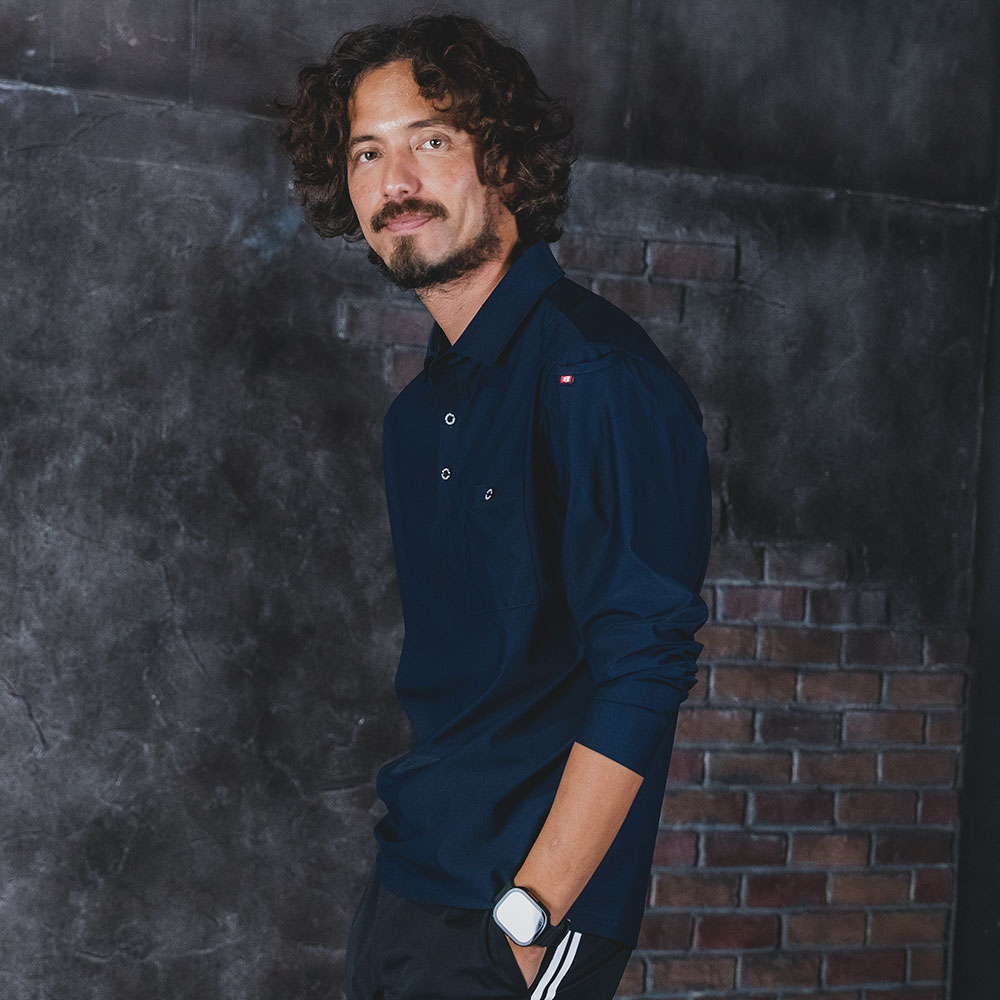 | 台襟付き仕様、袖マルチポケット(左)(意匠登録)、胸ポケット(左)、後裾ラウンドカット、バックプリントネーム、脇消臭テープ |