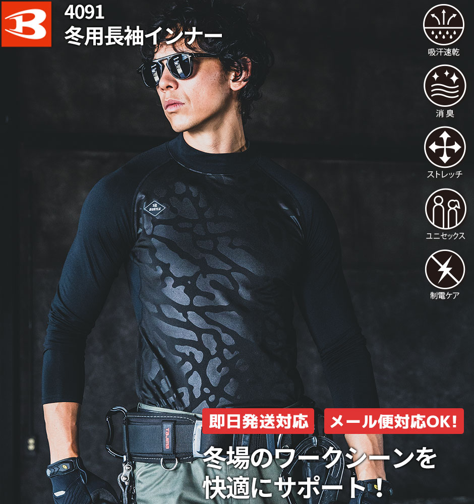 バートル 防寒インナーシャツ 4091 BURTLE 長袖インナー 冬用 裏起毛 メンズ レディース コンプレッション アンダーウェア ホットフィッテッド ストレッチ 吸汗 速乾 制電 消臭 迷彩 人気 安い 激安 防寒着 防寒服 おしゃれ 暖かい 最強 かっこいい[メール便対応]