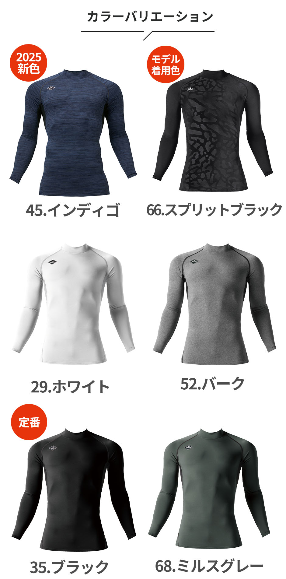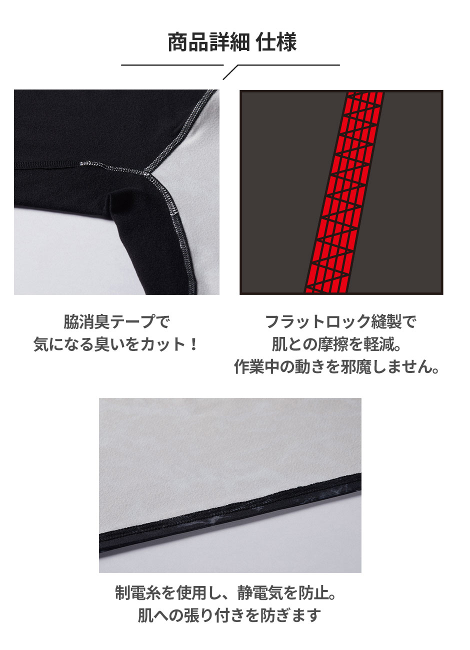 防寒インナーは筋肉の疲労軽減やケガ防止、寒さ対策や風邪予防をすることができます。伸縮性があり動きやすく作業効率があがる、生地が伸びる、しゃがむことが多い現場に最適です。適度な締め付けにより疲労の元になる無駄な筋肉の揺れを防ぎ、スタミナの向上や疲労感の軽減など、さまざまな面で体をサポートしてくれます。伸縮性があれば、体の動きを邪魔せず、さらに肌に柔らかくフィットするため、長袖を着ているという違和感を感じずに活動できます。また素材により、通気性は優れており、ムレることなく、快適に活動できます。さらに、汗を外に逃がすことで体温調節もサポートします。また作業現場はもちろん、アウトドア活動、スポーツ、通勤、通学など、多様なシーンでも活躍します!
