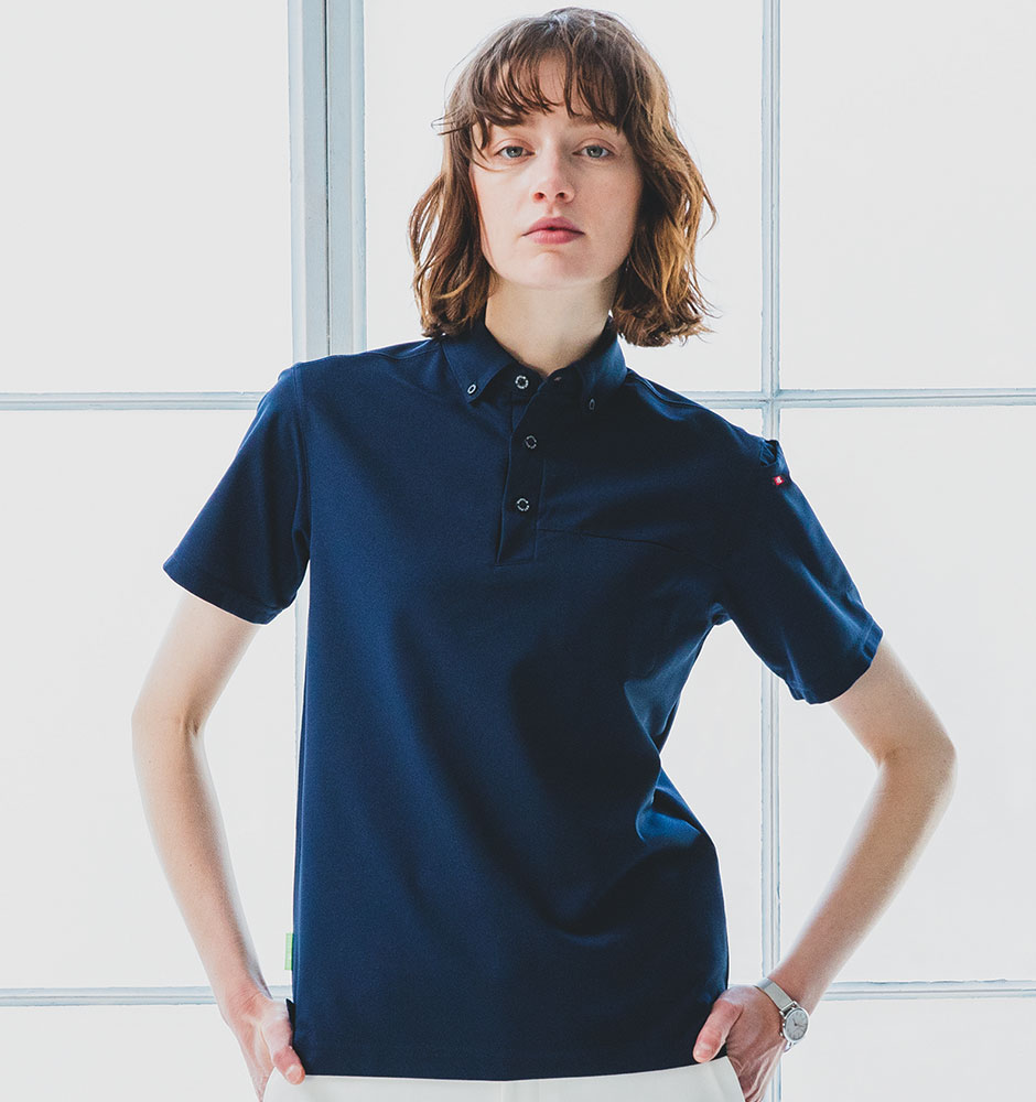 衿元のボタンダウンがフォーマルなムードを演出するSDGsに対応したエコロジカルなポロシャツ