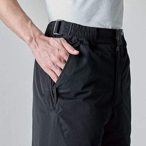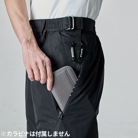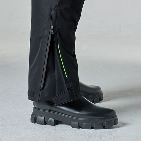 両脇ポケット、ウエストアジャスターベルト、スルーポケット(右)、ツインループ(左脇)、左サイドジッパーポケット(長財布・レベルブック・スマートフォン収納可能)、アルミメッシュ(裏地)、ライムリフレクター(両裾)、裾ファスナー、撥水加工