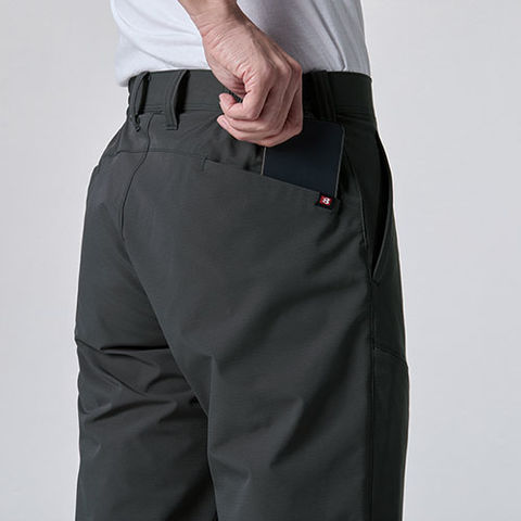 ツインループ(右前・左脇)、サイズチップ(左)、後脇シャーリングゴム仕様、スマホ収納バックポケット(左右)着席時スマホが干渉しない