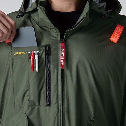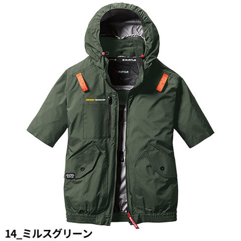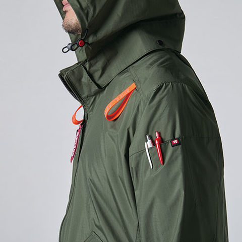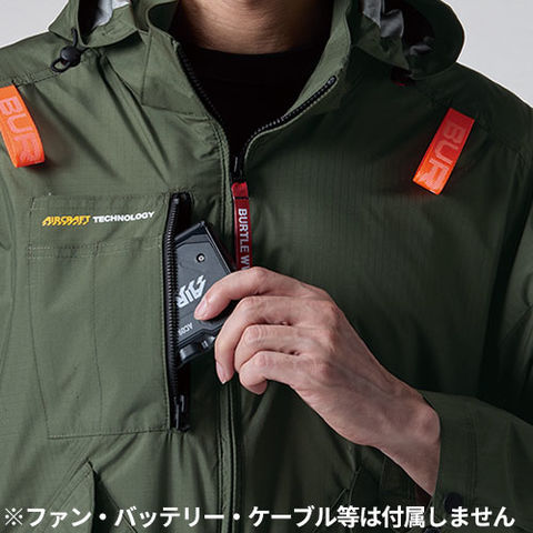 | 大型フードスピンドル付き(ボタン止め着脱仕様)、フードプリント、バッテリー収納ポケット(右・ファスナー止め・コードホール付)、スマホ収納ポケット・ペンポケット(右)、ハーネスフックハンガー取付ベルト&取り出し口、内バッテリーポケット(左・ドットボタン止め)、両脇サイドファン(内側コードループ付き)、ランヤード取付口、衿ダイレクトエアー、袖ペンポケット |