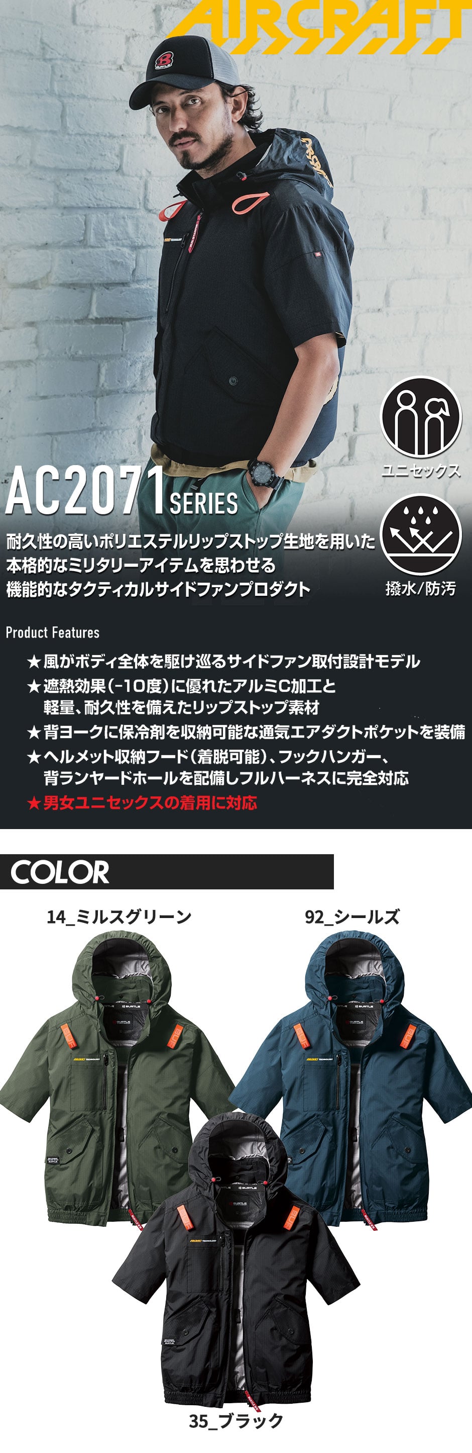 【即日発送】EFウェア バートル BURTLE AIRCRAFT エアークラフト AC半袖ブルゾン(ファン無し) 2025年モデル AC2076 作業着 作業服 春夏 フルハーネス対応 サイドファン 防汚 UVカット 遮熱 ヘルメット対応フード 涼しい