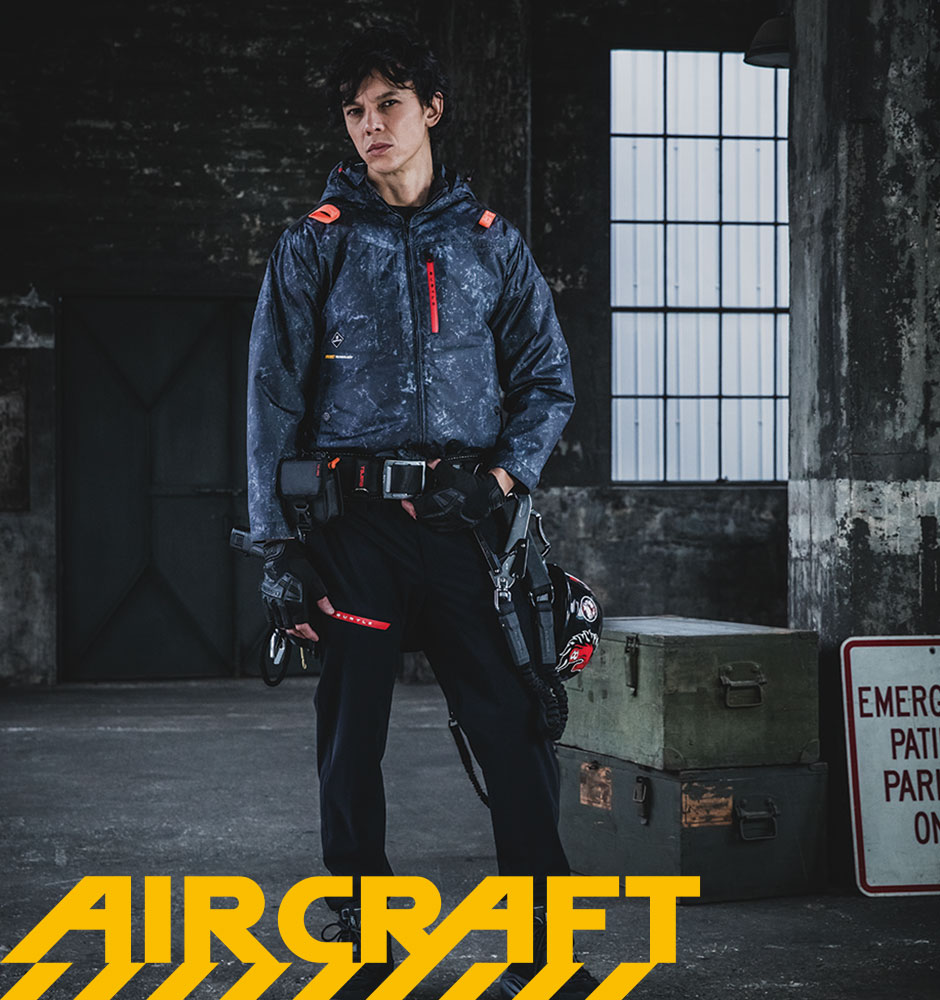 | 大型フードスピンドル付き(ボタン止め着脱仕様)、フードプリント、バッテリー収納ポケット(右・ファスナー止め・コードホール付)、バッテリー収納ポケット(左・ファスナー止め・コードホール付)、ハーネスフックハンガー取付ベルト&取り出し口、内バッテリーポケット(左・ドットボタン止め)、アームハイバックファン、ランヤード取付口、衿ダイレクトエアー、袖ペンポケット、袖口カフスアジャスター |