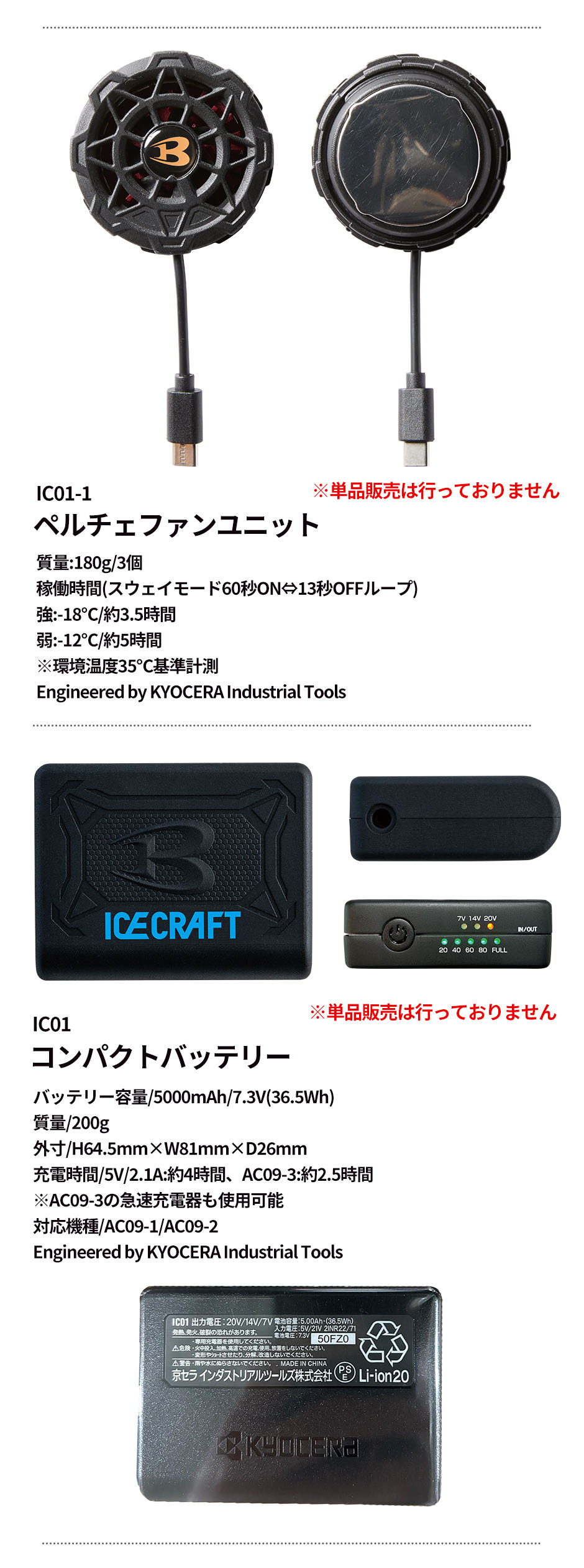 | ■バッテリー IC01 バッテリー容量/5000mAh/7.3V(36.5Wh) 質量/200g 外寸/H64.5mm×W81mm×D26mm 充電時間/5V/2.1A:約4時間、AC09-3:約2.5時間※AC09-3の急速充電器も使用可能 対応機種/IC01-1,AC09-1/AC09-2,AC08-1/AC08-2,AC370/AC371,AC310/AC311 ※IC01-1,AC09-1/AC09-2,AC08-1/AC08-2,AC370/AC371,AC310/AC311ファンの専用品です。 稼働時間:20V:30分+14V:約3時間(約85L/秒) 14V:約4.5時間(約60L/秒),7V:約24時間(約30L/秒) ※フル充電時の値です。着用条件、環境の違いに応じて稼働時間が異なります。 連続稼働時間の誤差は、初期不良の対象とはなりません。 ※稼働時間、風量はAC09-1を駆動した場合の値です。 Engineered by KYOCERA Industrial Tools ■ファンユニット IC01-1 質量:180g/3個 対応機種:IC01,AC09,AC08,AC360,AC300 IC01,AC09,AC08,AC360,AC300バッテリーの専用品です。 稼働時間※(スウェイモード60秒ON 13秒OFF) 強:-18度:約3.5時間 弱:-12度:約5時間 ※環境温度35度基準 Engineered by KYOCERA Industrial Tools ■ファンケーブル IC01-2 対応機種:IC01,AC09,AC08,AC360,AC300 IC01,AC09,AC08,AC360,AC300バッテリーの専用品です。 Engineered by KYOCERA Industrial Tools |