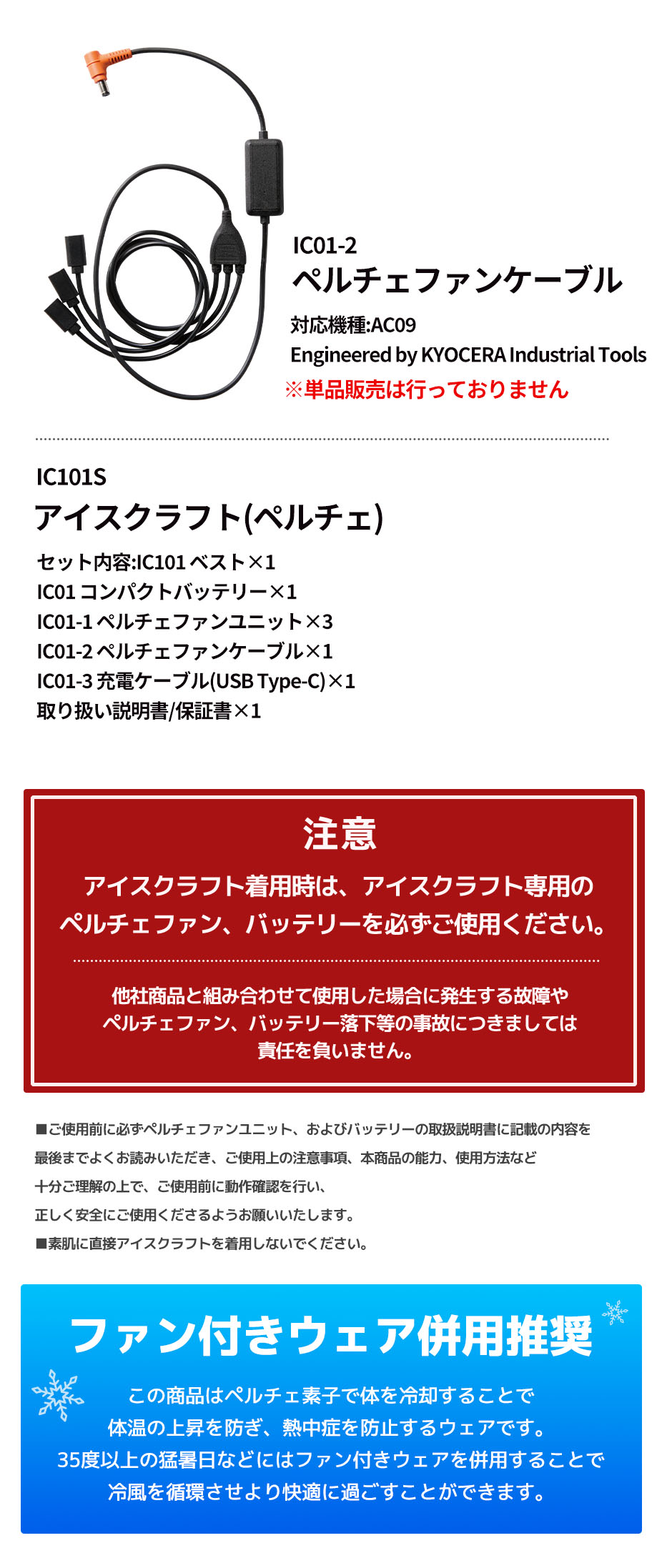 | アイスクラフト着用時は、アイスクラフト専用のペルチェファン、バッテリーを必ずご使用ください。 他社商品と組み合わせて使用した場合に発生する故障やペルチェファン、バッテリ落下時の事故につきましては責任を負いません。 ・ご使用前に必ずペルチェファンユニット、およびバッテリーの取り扱い説明書に記載の内容を最後までよくお読みいただき、ご使用上の注意事項、本商品の能力、使用方法など十分ご理解の上で、ご使用前に動作確認を行い、正しく安全にご使用下さるようお願いいたします。 ・素肌に直接アイスクラフトを着用しないでください。 |
