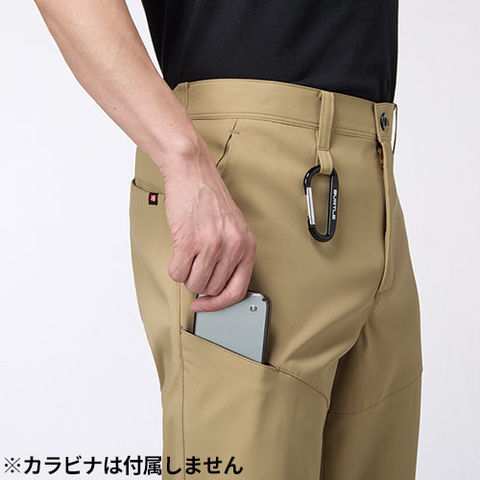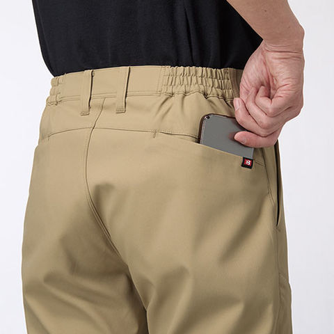 | サイズチップ(左)、右Phone収納バックポケット(着席時スマホが干渉しないポケット)、後脇シャーリングゴム仕様、ツインループ(右前・両脇)、Phone収納ポケット(右) |