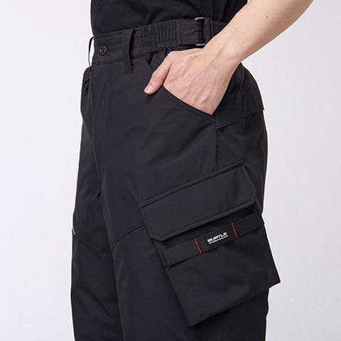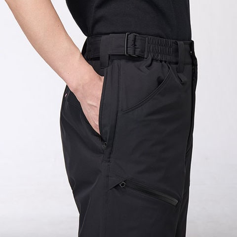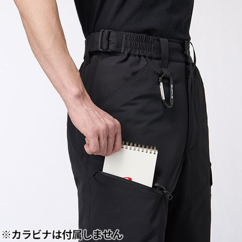 | フラップ付きピスポケット、スルーポケット(右)、ウエストアジャスターベルト、ツインループ(右前)、レベルブック・Phone収納ファスナーポケット(右)、両脇ウォームポケット、裾アジャスター |