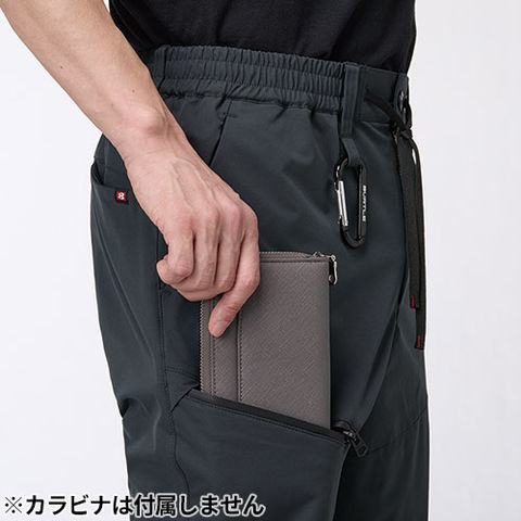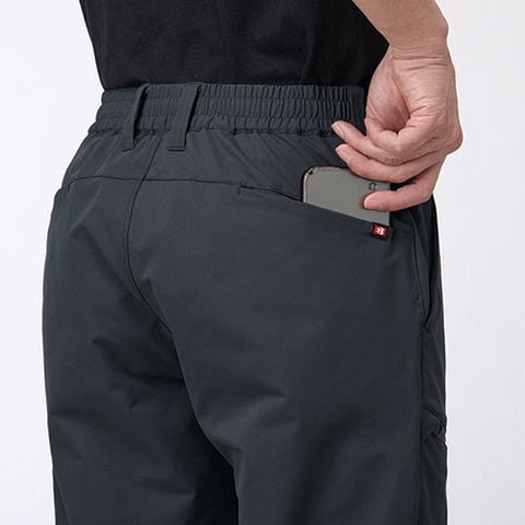 | ウエストシャーリングゴム仕様、左右Phone収納バックポケット(着席時スマホが干渉しないポケット)、長財布・レベルブック・Phone収納ファスナーポケット(右)、ウエストドローコード、ペンさし・Phone収納ポケット(左)、ツインループ(右前・両脇)、サイズチップ(左) |