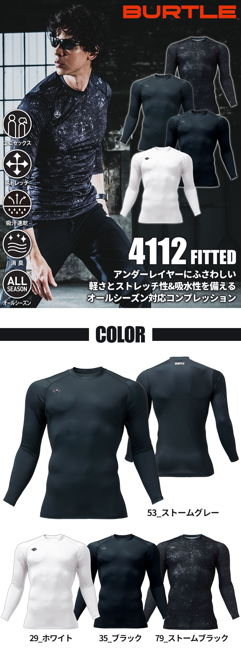 [即日発送]バートル コンプレッションインナー BURTLE インナー フィッテッド 4112 メンズ バートル コンプレッション 長袖 作業着 ストレッチ 消臭 吸汗速乾 通年 軽量 UVカット 吸水速乾 作業服 人気 おしゃれ かっこいい アウトドア スポーツ 普段使い 男女共用 メール便