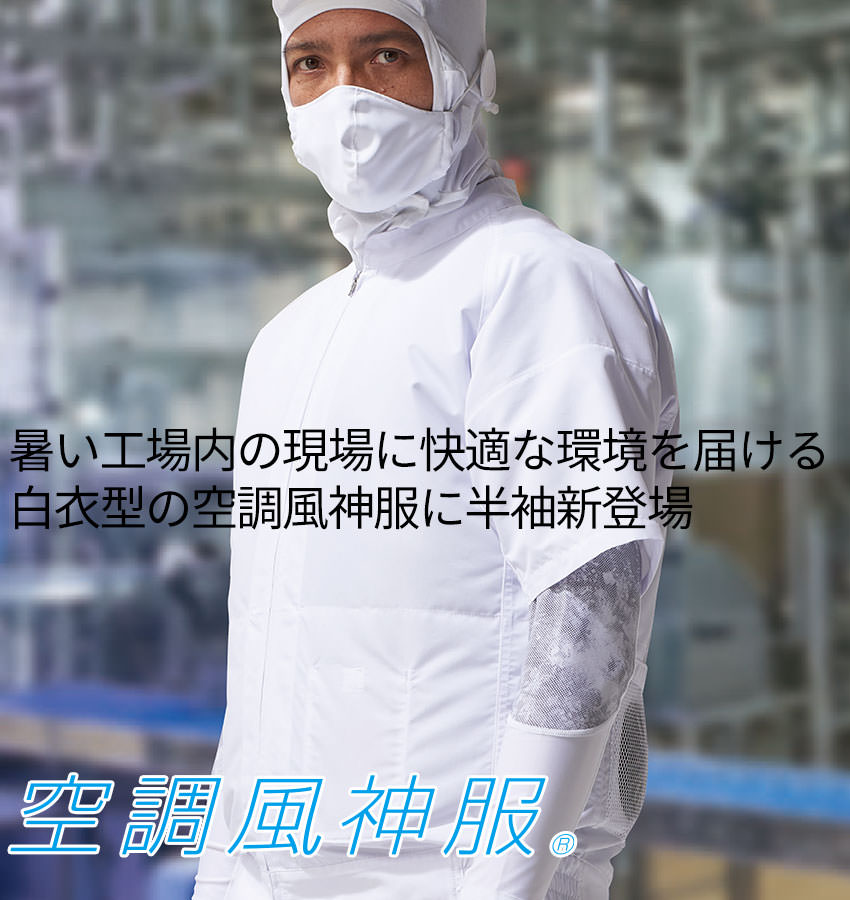 暑い工場内の現場に快適な環境を届ける白衣型の空調風神服に半袖登場