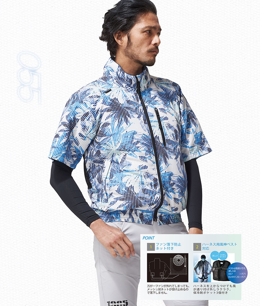 | UVカット、保冷材入れ、背中風気路、胸ジップファスナー、逆玉ポケット、ハーネス用風神ベスト対応 |
