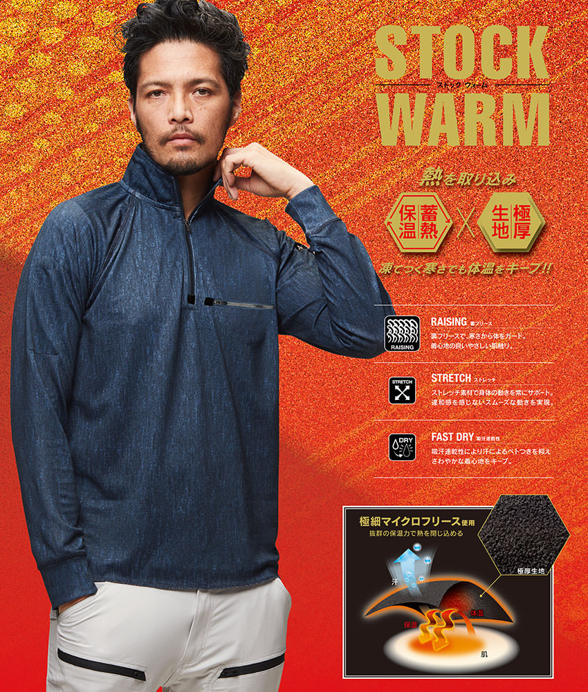 極細マイクロフリースを使用した蓄熱保温ベースインナー。優しくあたたかい裏起毛仕様。