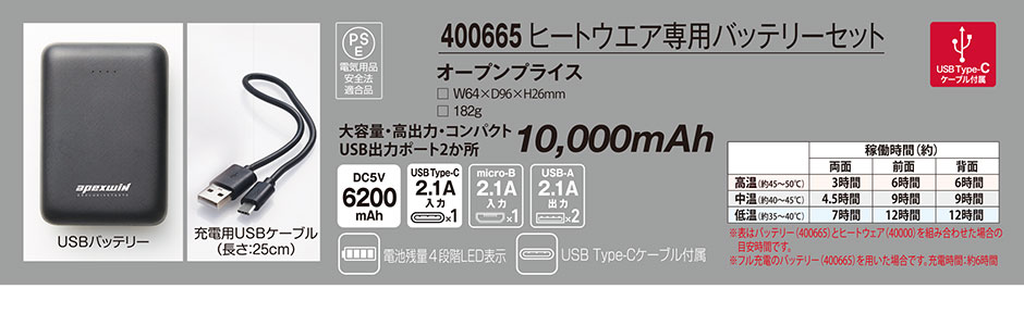 電熱ウェアバッテリー アタックベース ATACK BASE ヒートウェア専用バッテリーセット 400665 作業着 作業服 防寒