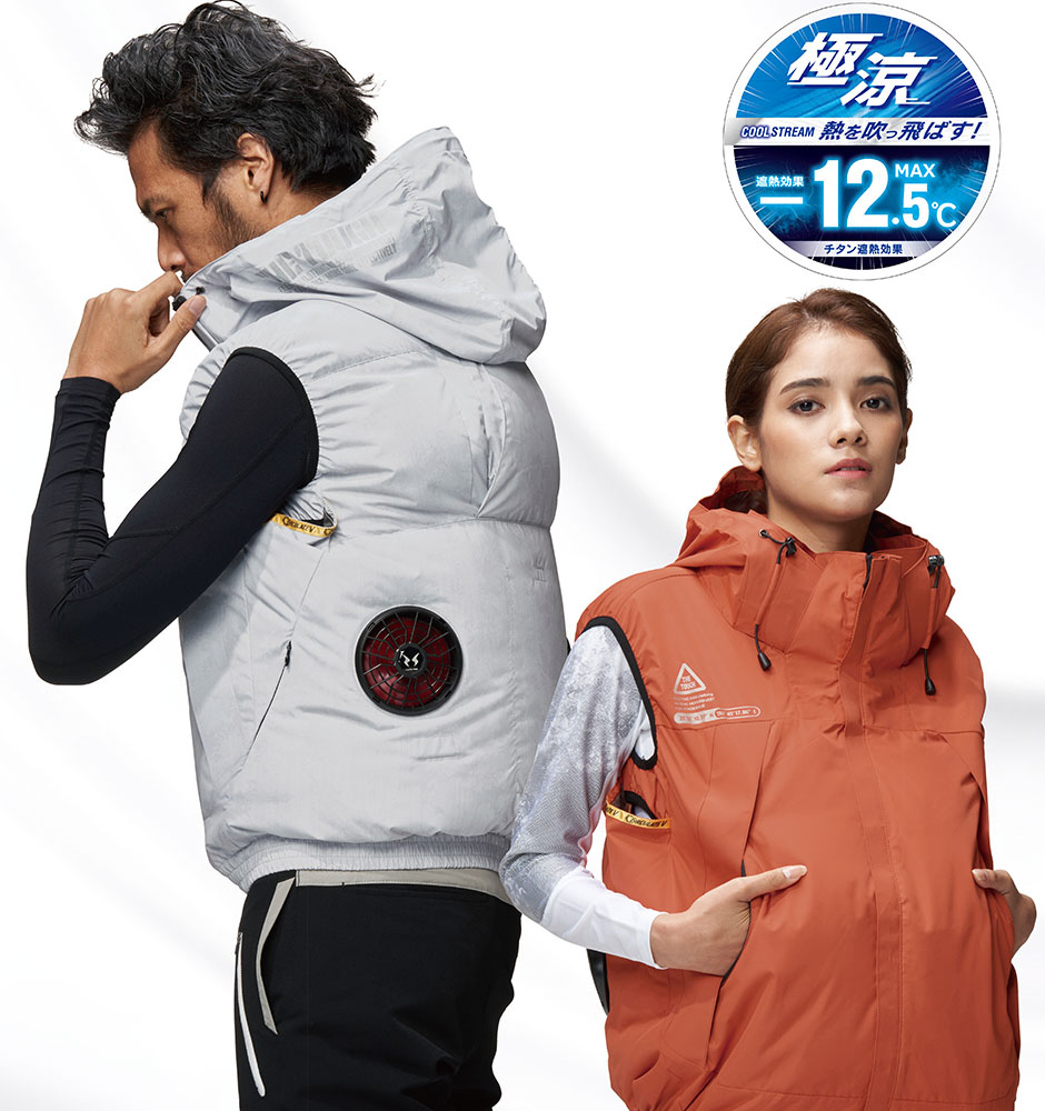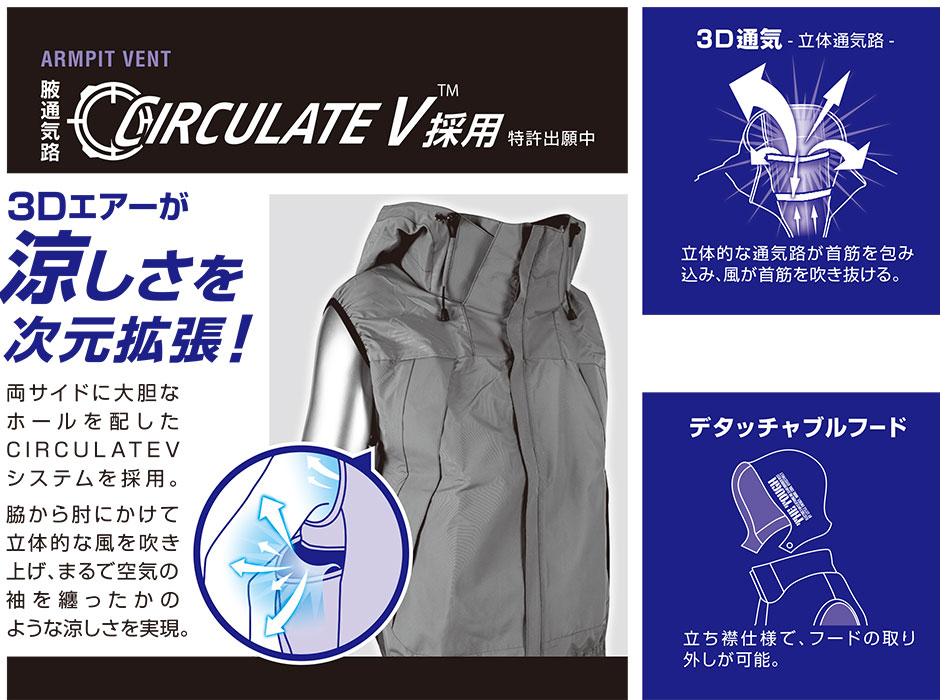| 裏チタン加工、一次撥水、3D通気衿、保冷剤入れ、背中通気路、反射プリント、デタッチャブルフード、CIRCULATE V |