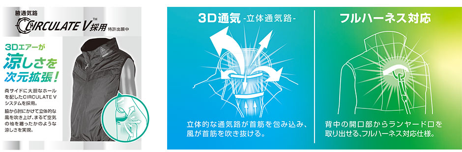 | 裏チタン加工、背中フルハーネス取出し口、一次撥水、3D通気衿、保冷剤入れ、CIRCULATE V、胸フック掛け |