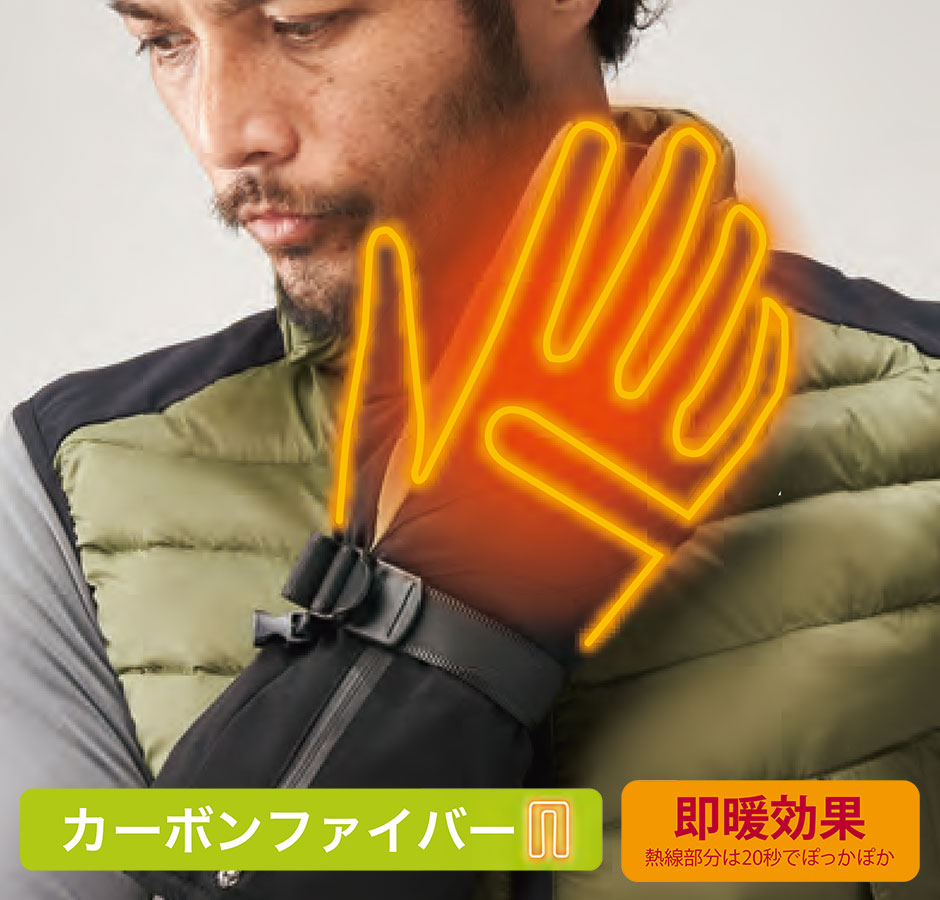 | カーボンファイバー、断熱素材で保温性アップ、7.4V高温設定、ACアダプター、シングルスイッチ、防水設計、手洗い可、専用ミニバッテリー2台付属、防風 |