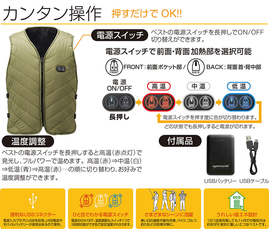 | いつも清潔 手洗い可能、即暖効果 高機能素材カーボンナノチューブヒーター採用、電源スイッチで前面・背面 加熱部を選択可能、保温性抜群のダウンパック中綿、サイドバックル |