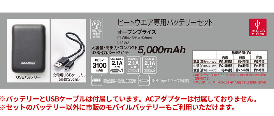 | ※ベストとバッテリーと充電用USBケーブルのセットです。ACアダプターは付属しておりません。 ※バッテリーは市販のモバイルバッテリーもご利用いただけます。 |