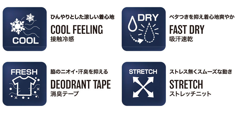 | 接触冷感、吸汗速乾、消臭テープ、ストレッチ |