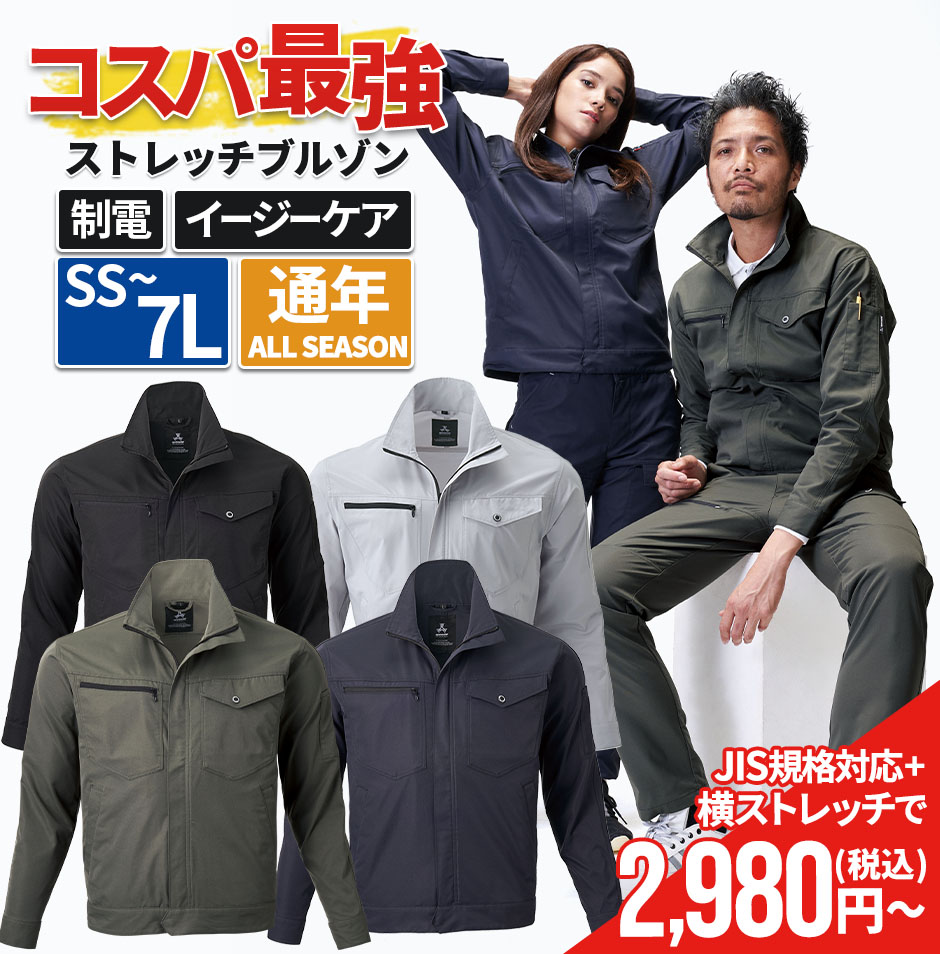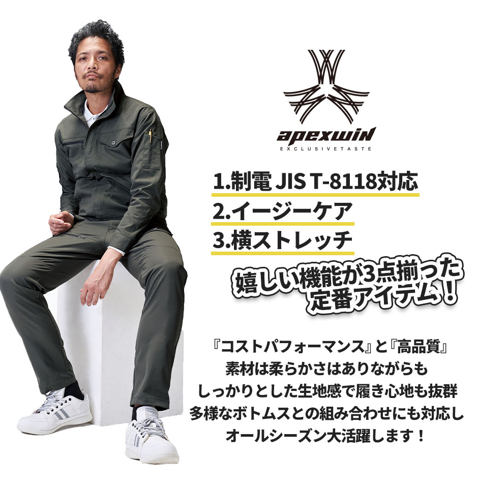 【制電 JIS T-8118適合】【イージーケア】【ストレッチ】を装備した、サイズ展開充実のワークウェア。