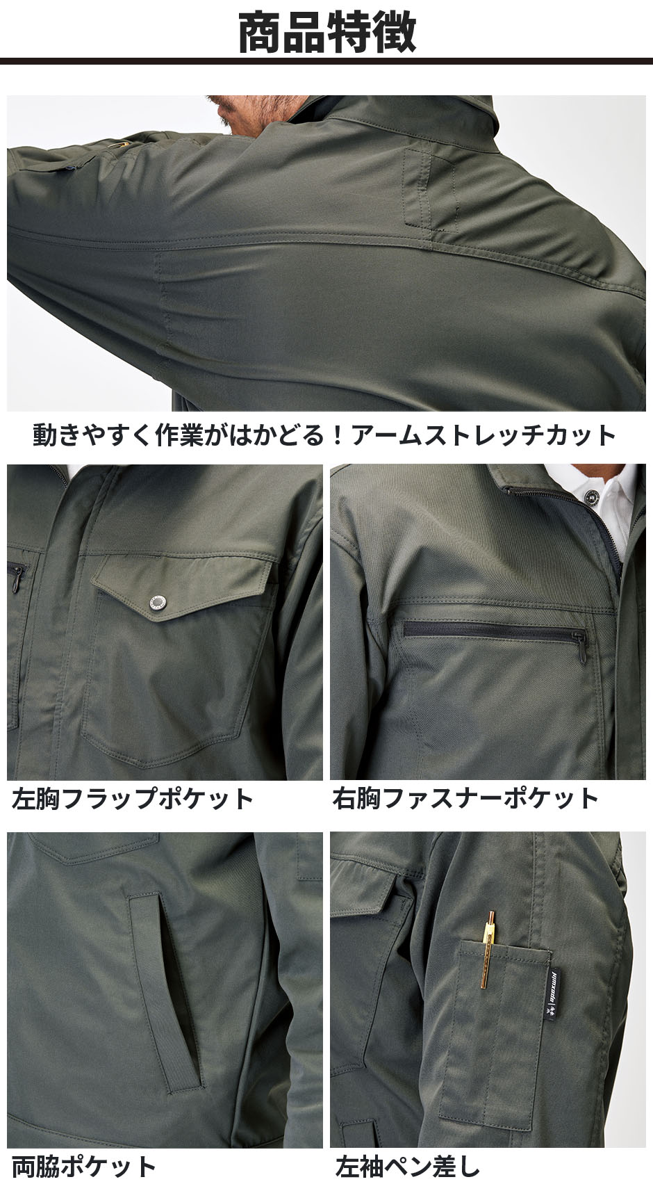 | 左袖ペン差し,両脇ポケット,右胸ファスナーポケット,左胸フラップポケット,アームストレッチカット |